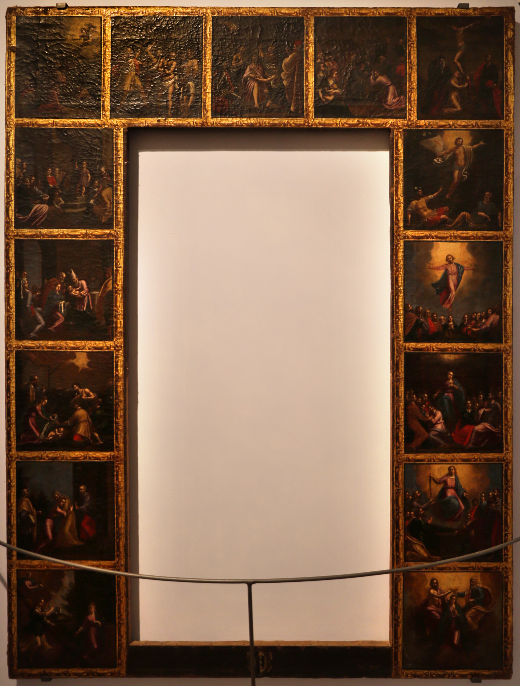 Il priore Alessandro Bisagni nel 1615, all’epoca delle ristrutturazioni che egli promosse nella chiesa di San Gavino, fece realizzare questa tela, raffigurante i Misteri del Rosario, quale incorniciatura alla tavola trecentesca della Madonna con il Bambino (Cfr. Palazzo dei Vicari a Scarperia e Raccolta d’arte sacra “Don Corrado Paoli” a Sant’Agata)