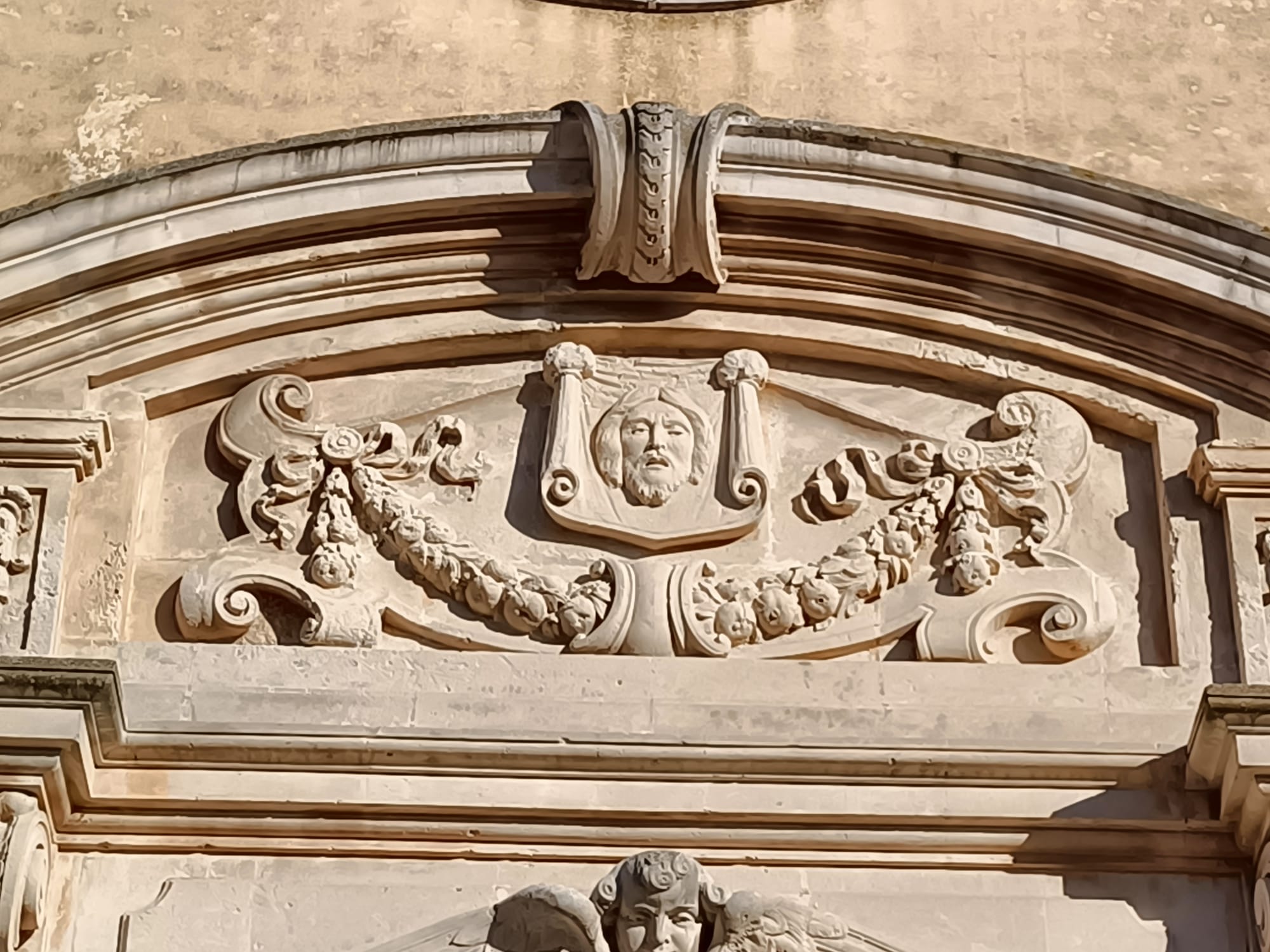 Veronica, soprapporta, rilievo in pietra, 1600-1699, chiesa di San Nicola Magno, Salve (Le), Italia.