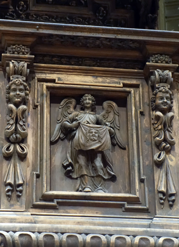 Fratelli Donati, Valdidentro, Angelo con il velo della Veronica, pulpito, rilievo in legno, 1672, chiesa di S.Ignazio, Bormio (So), Italia.