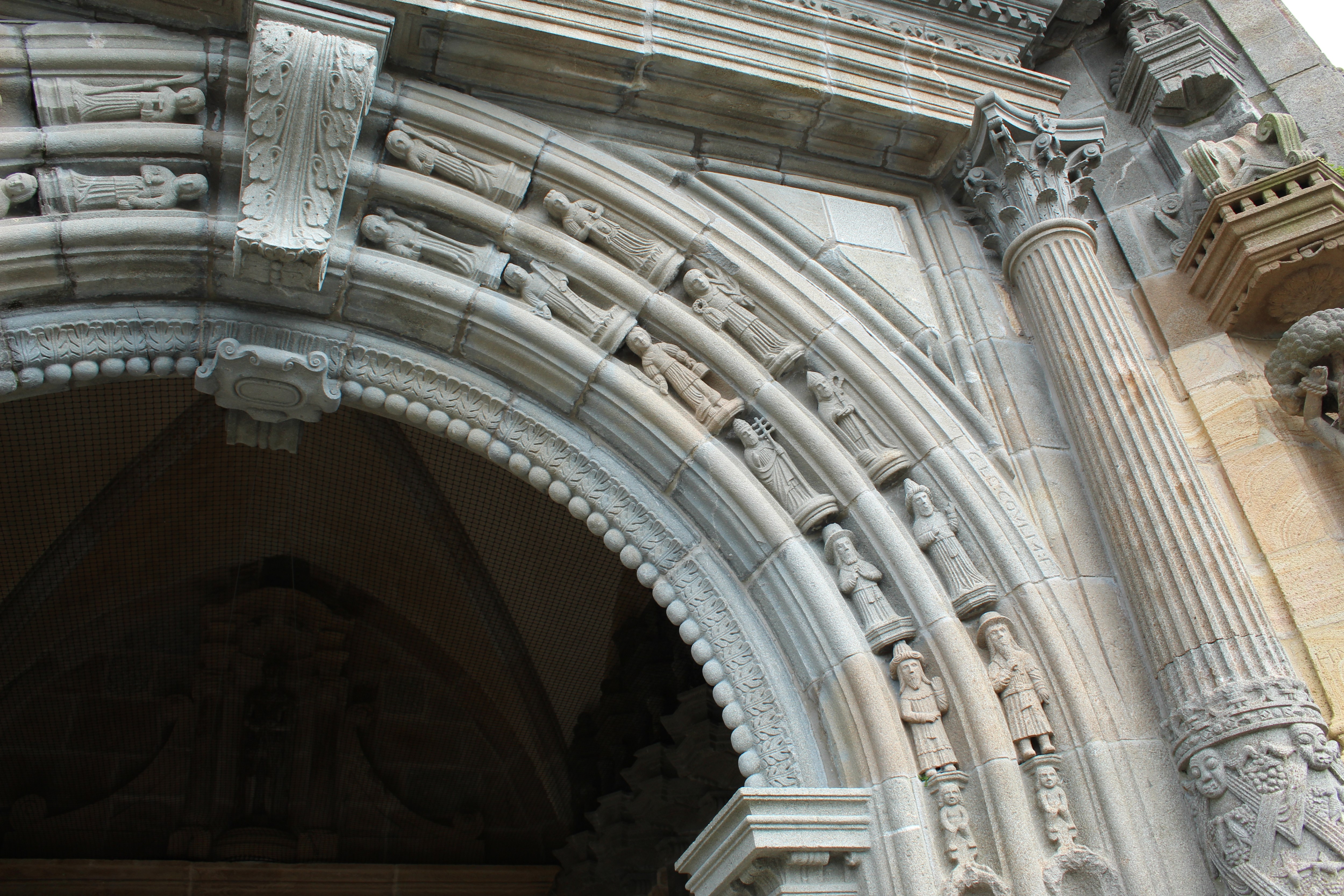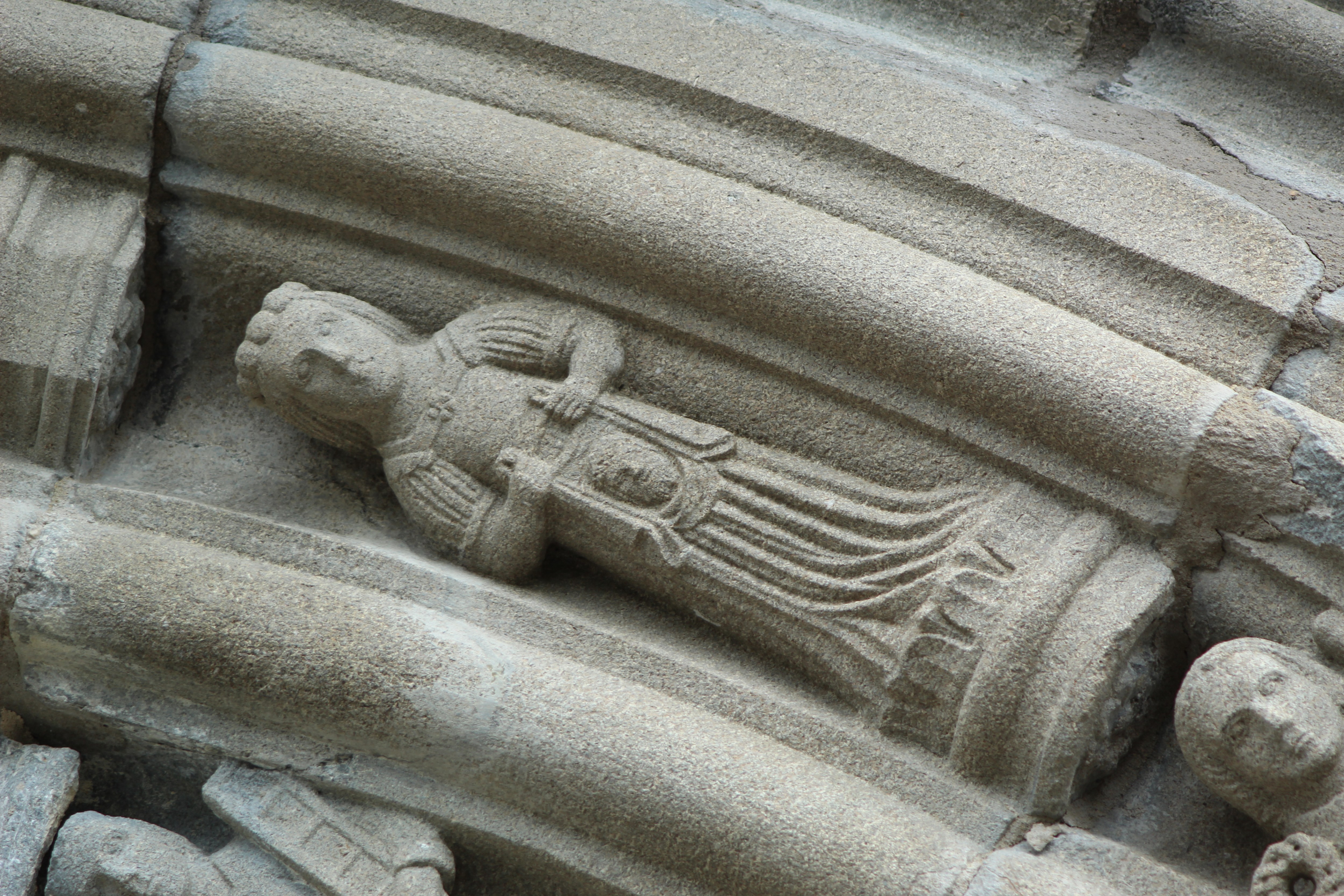 Figura femminile con il velo della Veronica, part., Figure con i simboli della Passione, portale, rilievo in pietra Logonna e Kersanton, 1665, portale sud, Eglise Saint-Pierre, Ploudiry, Francia.