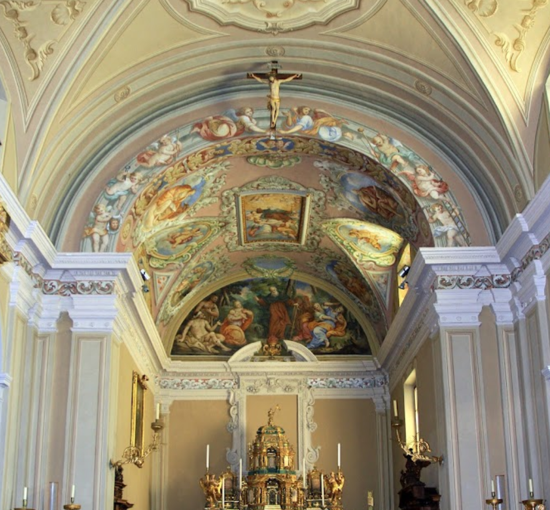 Sopra l’arco trionfale dell’altare sono rappresentati gli angeli con gli strumenti della Passione. Nella chiesa è conservato un dipinto, della seconda metà del XVII secolo che presenta il territorio con particolare precisione. Qui la descrizione.