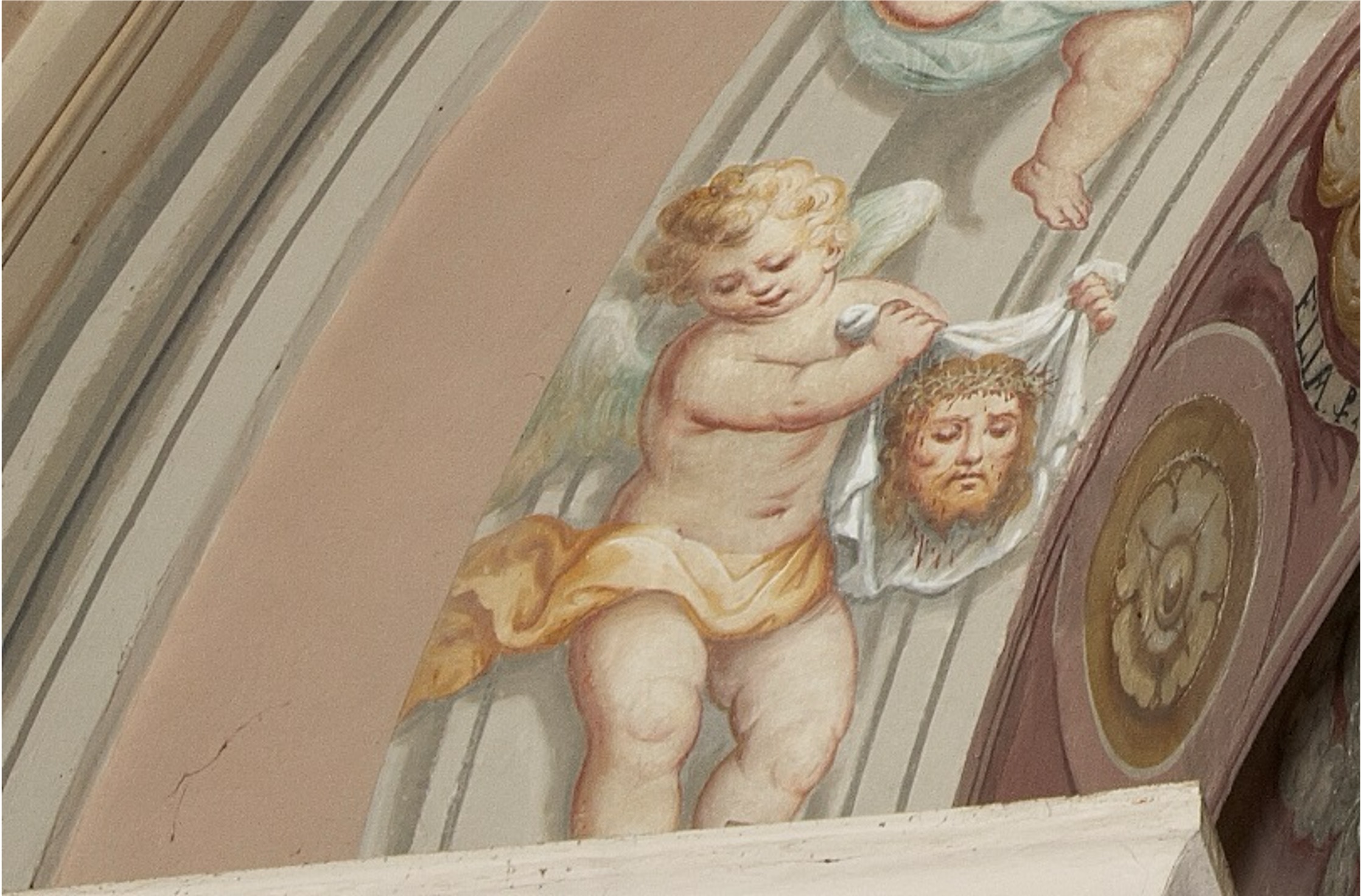 Angelo con il velo, affresco, 1650-1749, arco trionfale, chiesa parrocchiale Sant'Antonio, Crebbio, Abbadia Lariana (Lc), Italia.