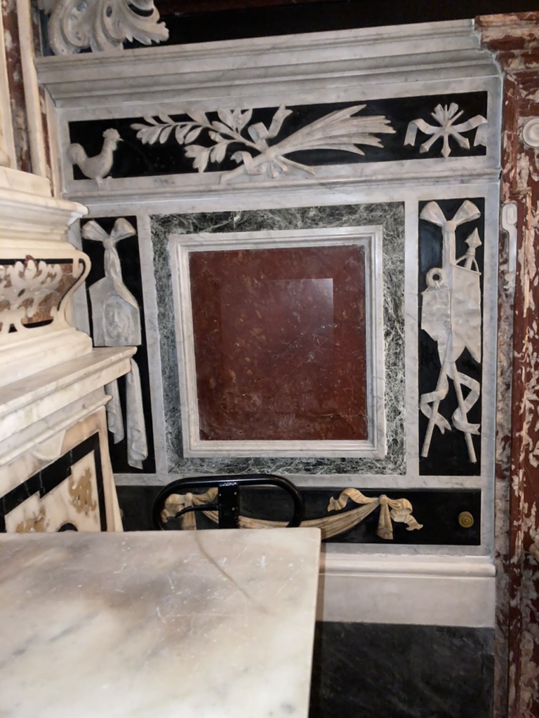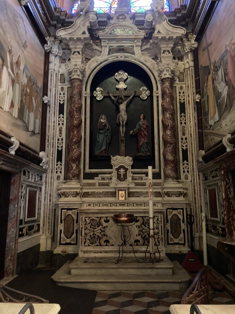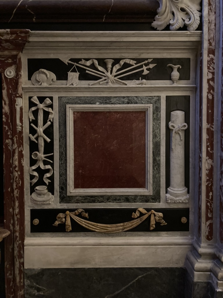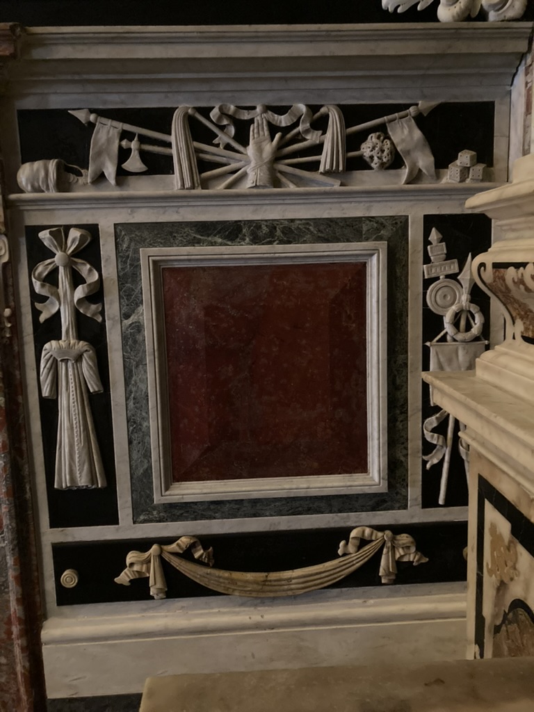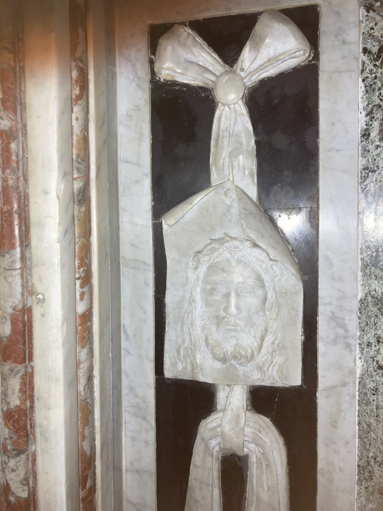 Veronica e simboli della Passione, rilievo, 1680-1703, altare del Crocifissso, basilica di Santo Stefano, Lavagna (Ge), Italia.