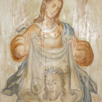 Santa Veronica con il velo, olio su tavola, pannello in legno del soffitto a cassettoni, 1717, pfarrkirche St. Johannes der Täufer, Kirchendemenreuth, Germania.