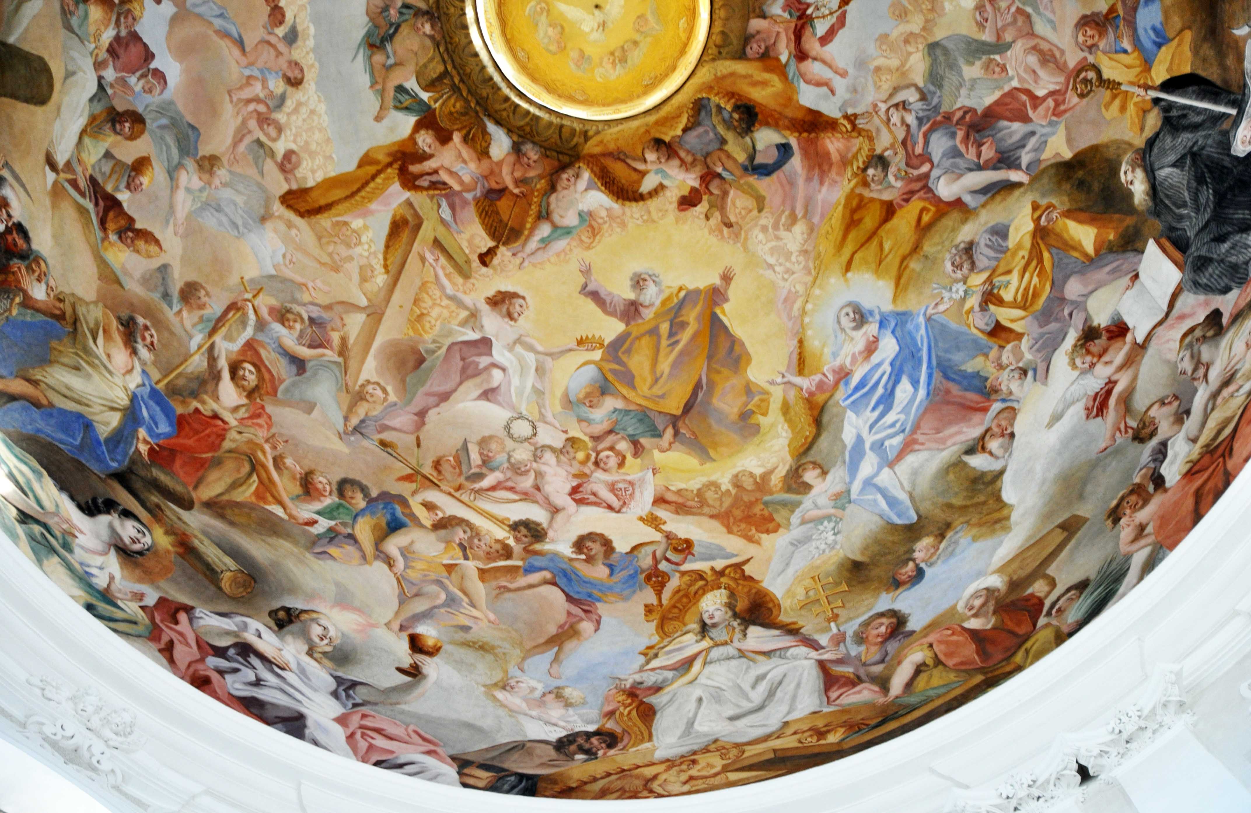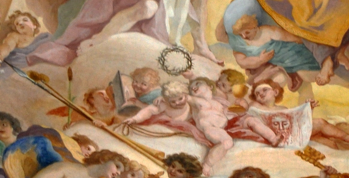 Cosma Damian Asam, Angeli con i simboli della Passione, part., affresco, volta, 1718-1720, Trionfo di Cristo, Basilika St. Martin, Weingarten, Germania.