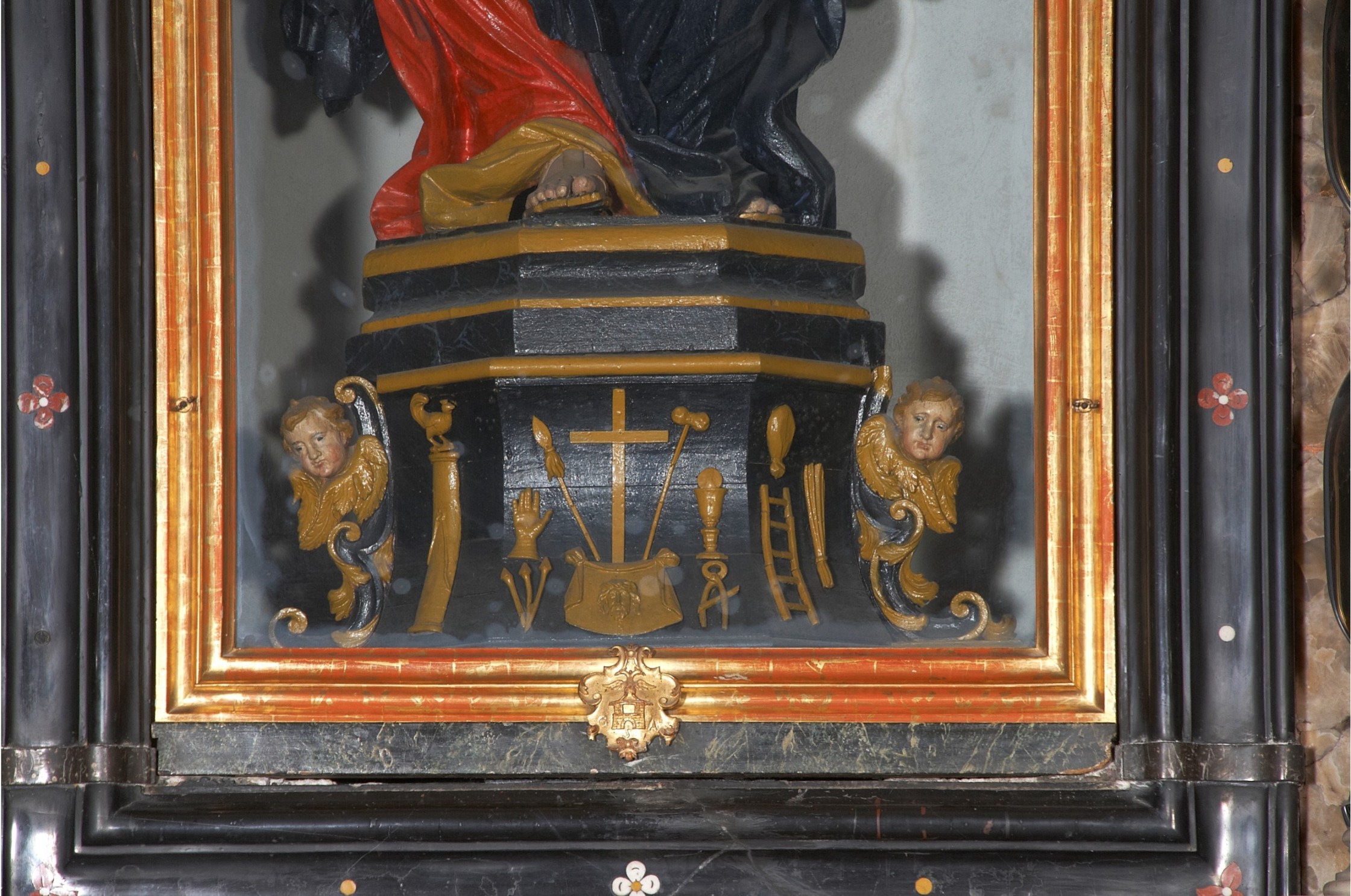Simboli della Passione, part., statua in legno policroma, basamento, 1716-1735, altare dell'Addolorata, chiesa di Santo Stefano, Dongo (Co), Italia.