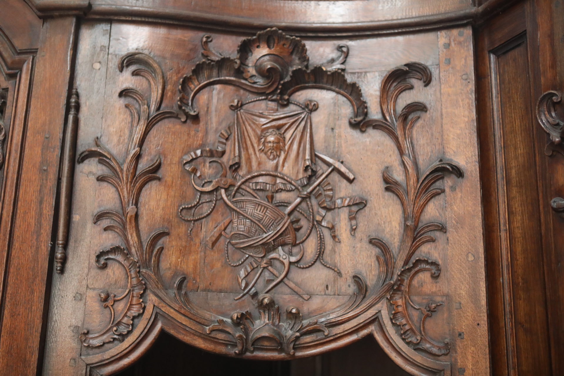 Velo della Veronica, part., Simboli della Passione, rilievo in legno, 1745 ca., confessionale, Chapelle Notre-Dame de Pitié, église saint Maclou, Rouen, Francia.