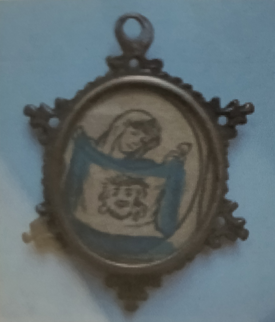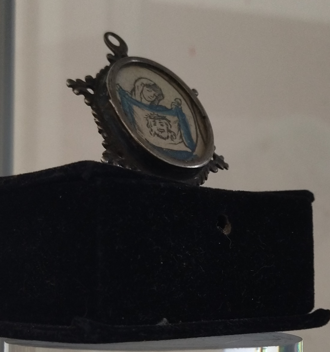 Nel piccolo ciondolo di metallo a forma di teca, dietro il vetro, l’immagine, colorata a mano, della Veronica che ostende il sudario. All’interno sono custoditi pezzi di carte da gioco tagliuzzate. Questo tipo di amuleto serviva a proteggere dalla dipendenza dal gioco d’azzardo.