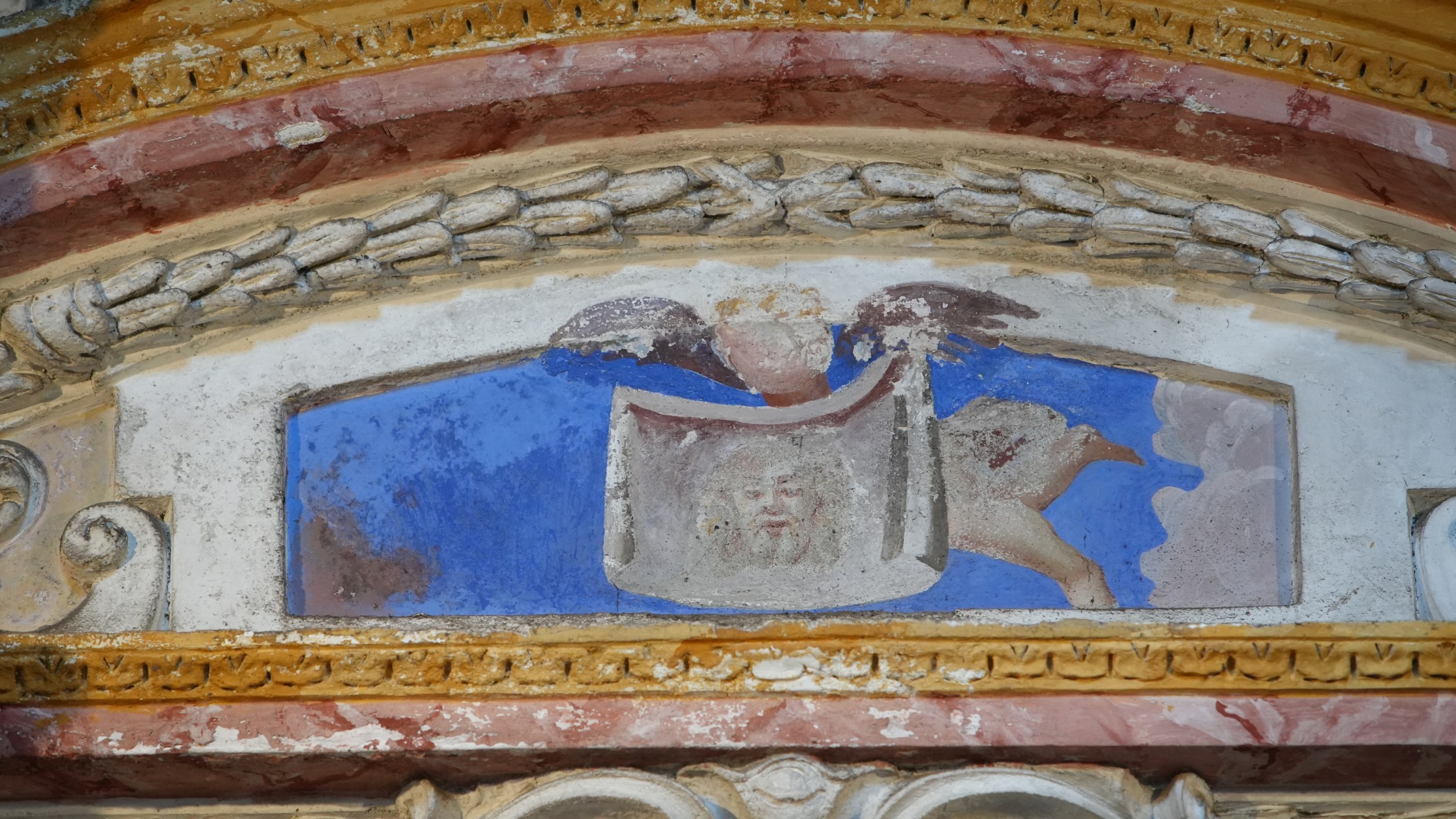 Angelo con il velo della Veronica, cimasa, 1700-1799, cappella del Crocifisso, chiesa di San Bartolomeo Apostolo, Loggio, Valsolda (Co), Italia.