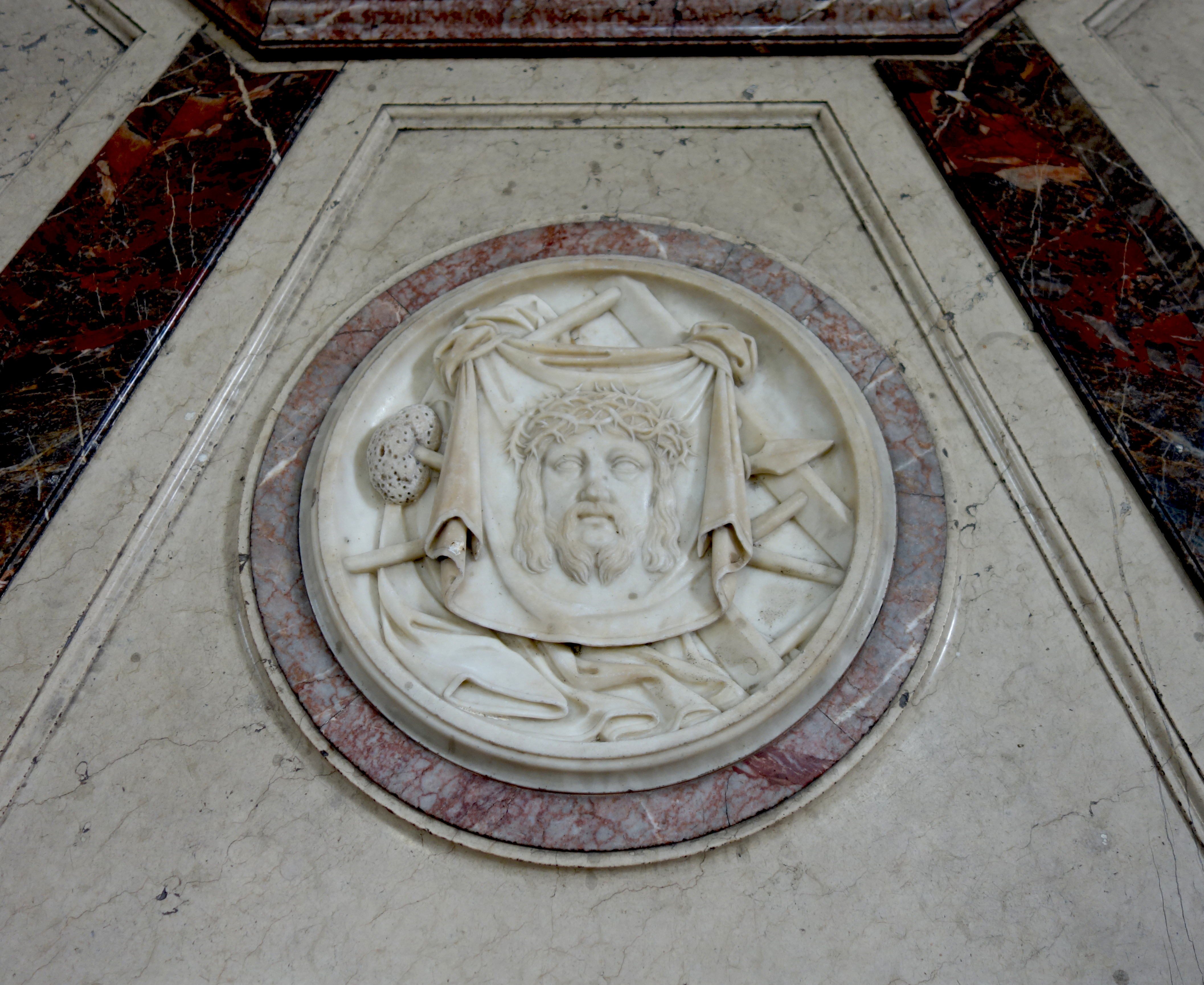 Velo della Veronica con i simboli della Passione, formella, rilievo in marmo, 1792, genuflessorio, basilica Concattedrale di S.Andrea, Mantova (Mn), Italia.