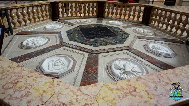 Al centro della crociera, il genuflessorio segna il punto in cui, nella cripta sottostante, sono custoditi i vasi con la terra bagnata dal sangue di Gesù, che, secondo la Tradizione, fu raccolta e nascosta da Longino.