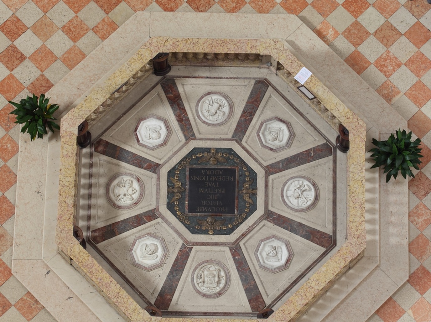 Le formelle con i simboli della Passione circondano la scritta centrale PROCVMBE VIATOR HIC PRETIVM TUAE REDEMPTIONIS ADORA