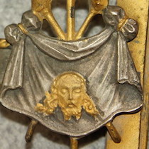 Simboli della Passione, part., rilievo, mensola porta reliquiari in bronzo dorato, 1850 ca., Italia. Collezione privata.