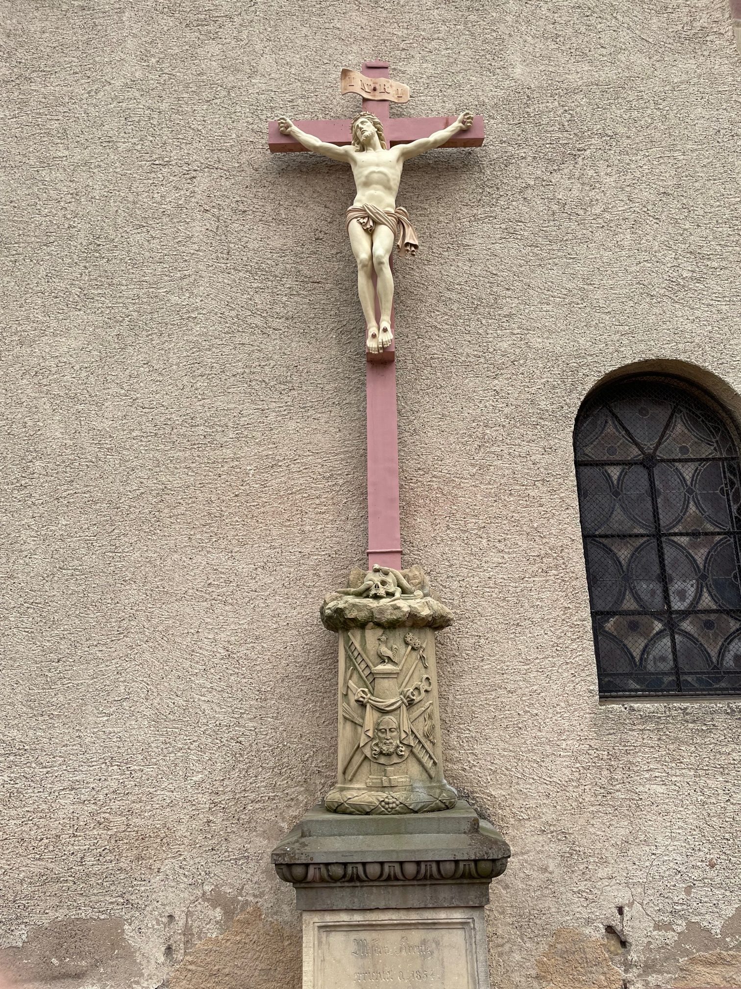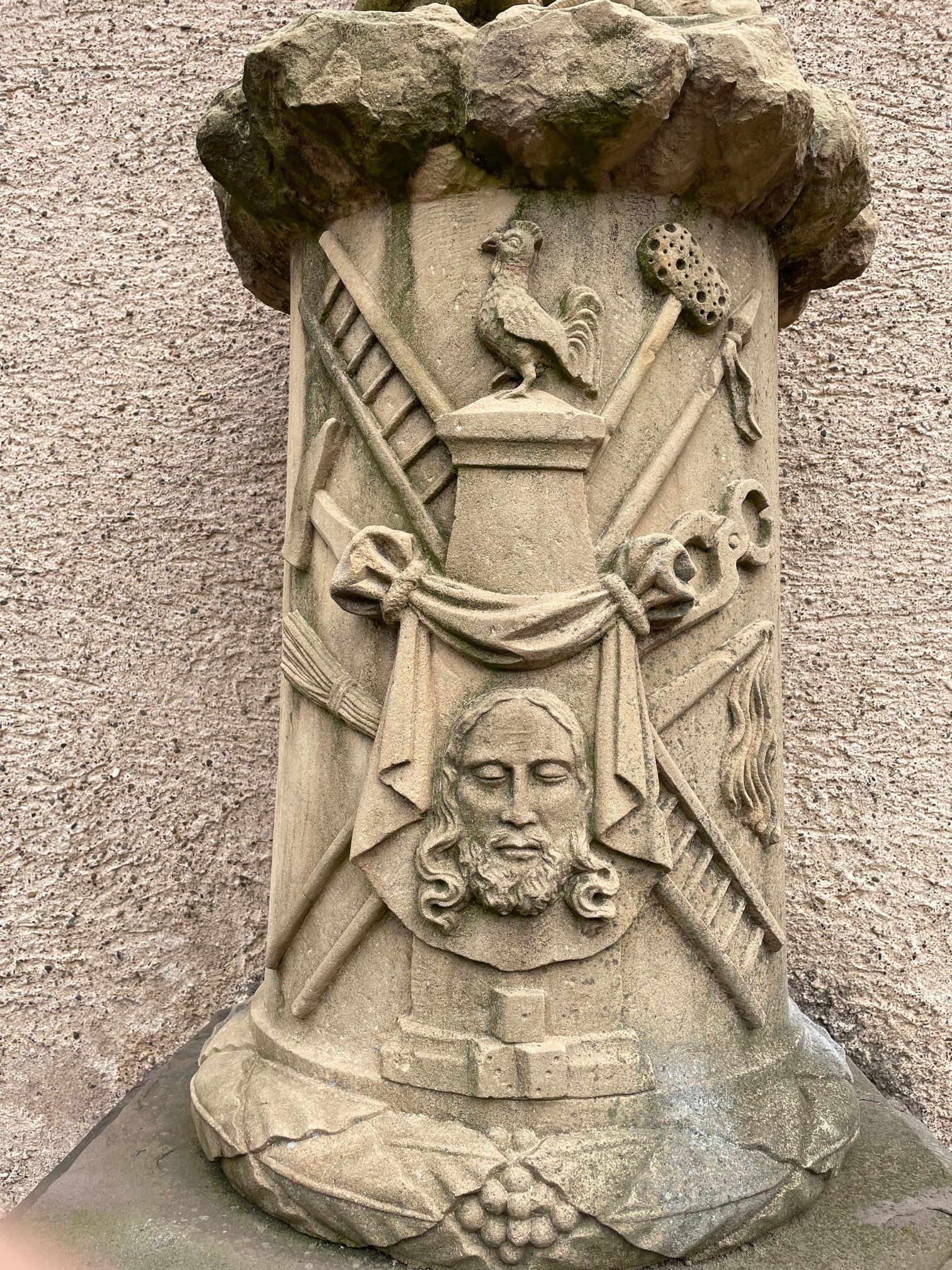 Velo della Veronica con i simboli della Passione, part., croce di missione, rilievo, 1854, esterno, Église Saints-Pierre-et-Paul, Eguisheim, Francia.