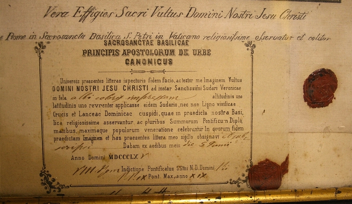 Velo della Veronica, reliquia a contatto, incisione, 1865, Roma, Italia. Collezione privata.