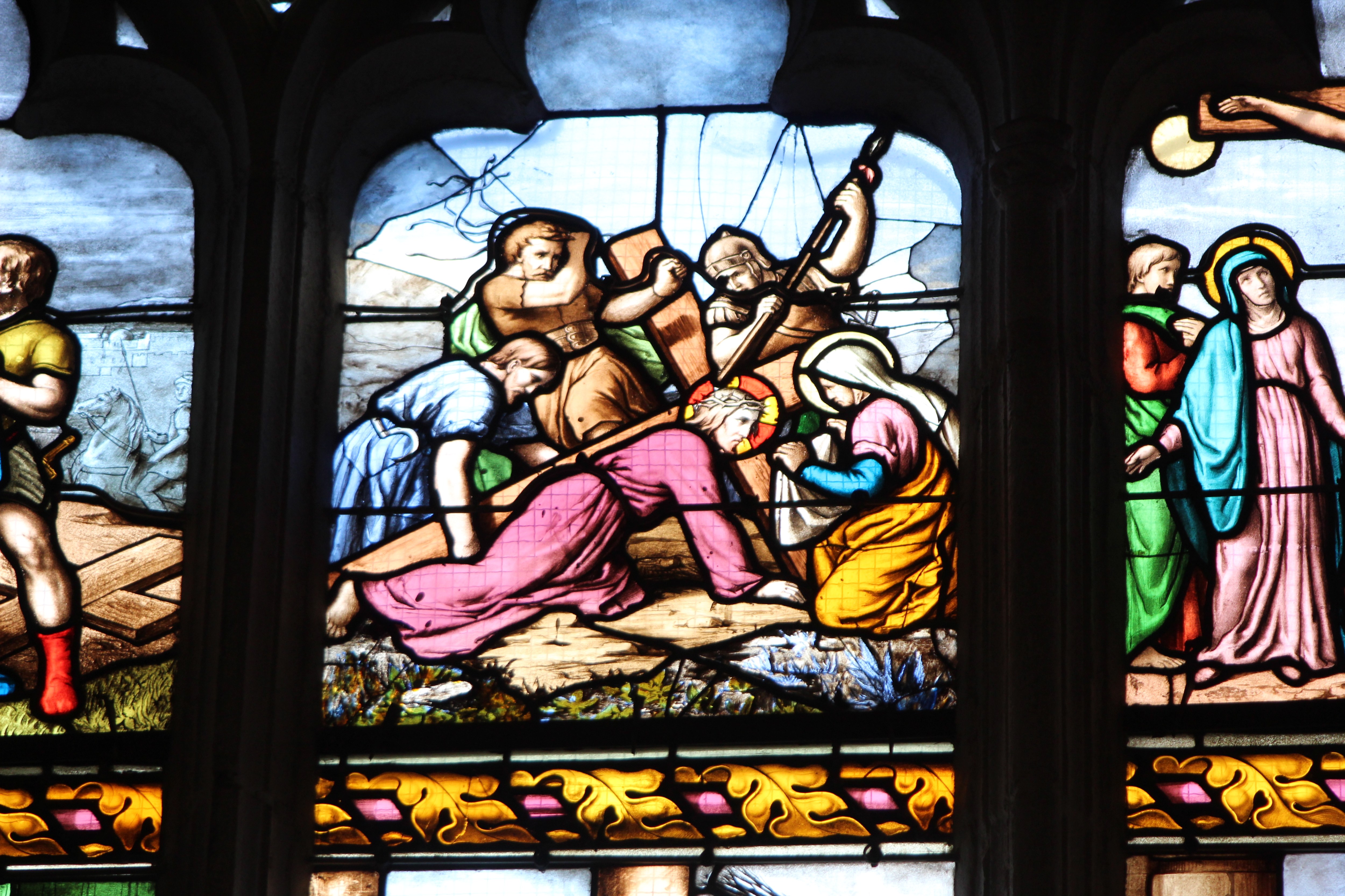 Storie della Passione e angeli con i simboli della Passione, vetrata, 1875, cappella della Passione, Cathédrale Saint-Corentin, Quimper, Francia.