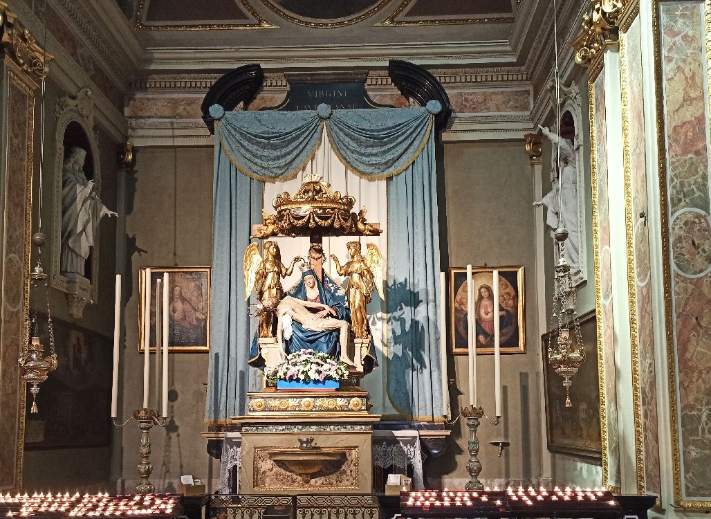 La storia del Santuario dell’Addolorata è legata a un evento prodigioso accaduto nel 1602. Secondo le cronache, a mezzogiorno del 18 agosto, una stella illuminò con tre raggi l’affresco della Madonna Addolorata, dipinto nel 1597 da Giovanni Giacomo Anselmi sul muro di una casa presso il ponte detto della Stongarda. Quei raggi restituirono all’effigie, in alcune parti molto logorata, alla sua originaria bellezza. La folla numerosa testimone del miracolo e di altri avvenuti nei giorni successivi chiese di costruire un santuario. Negli anni seguenti venne realizzato il gruppo ligneo dell’Addolorata, ispirato all’affresco, per poter celebrare processioni.