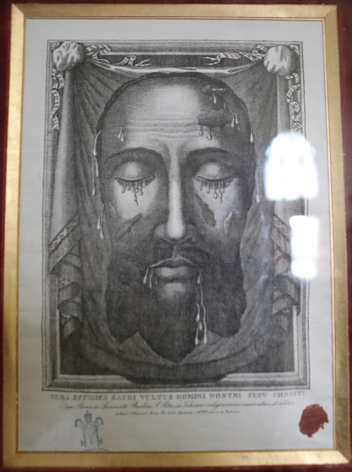 Velo della Veronica, reliquia a contatto, incisione, 1880-1899, église Sainte-Catherine, Sainte-Catherine-de-Fierbois, Francia.