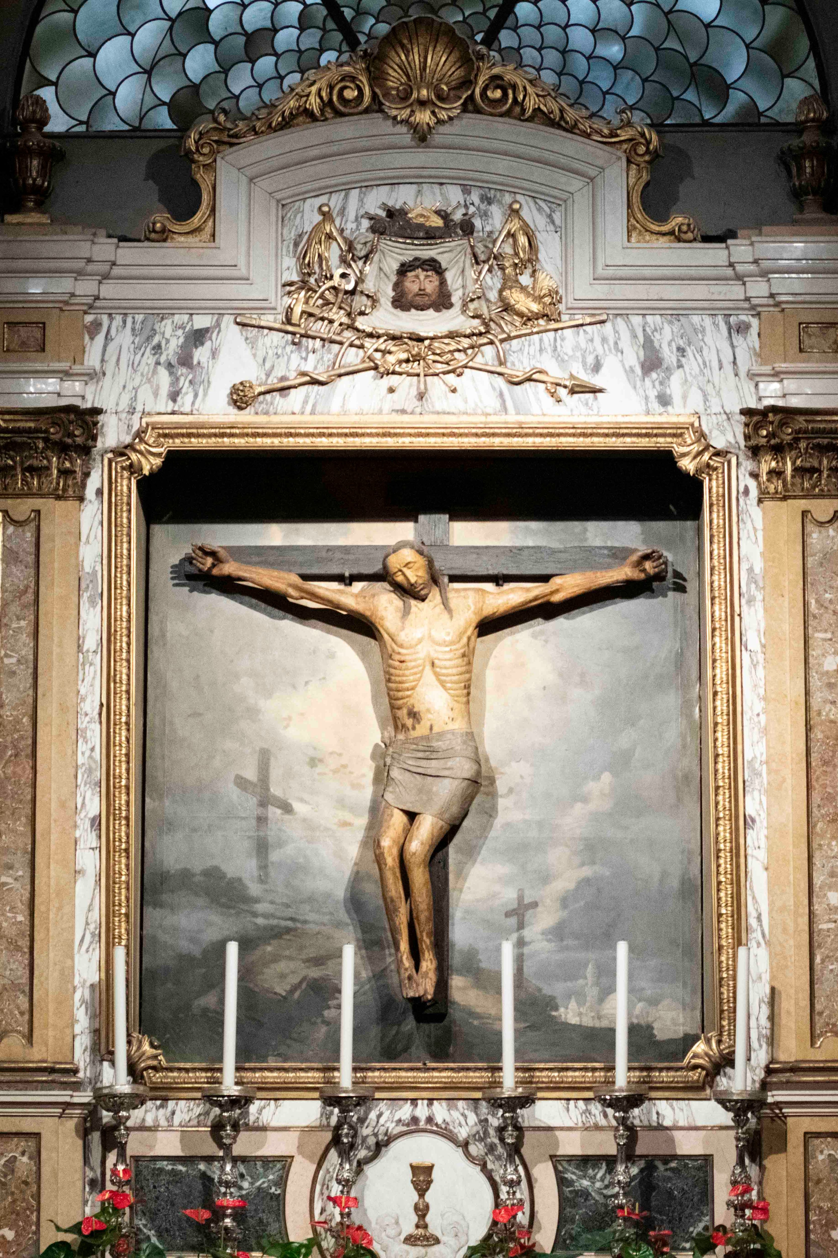 Angelo Bacchetta (progetto), Ferrario (esecuzione), Velo della Veronica con i simboli della Passione, cimasa, rilievo in legno policromo e dorato, marmo, 1904, cappella del Crocefisso, cattedrale di Santa Maria Assunta, Crema (Cr), Italia.