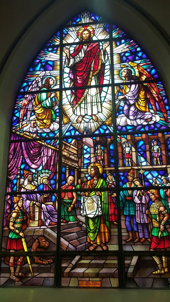 San Giuda mostra il velo a Abgar re di Edessa, vetrata, 1943, Our Lady of Victories church & The shrine of St. Jude, Paterson, NJ, Stati Uniti d'America.