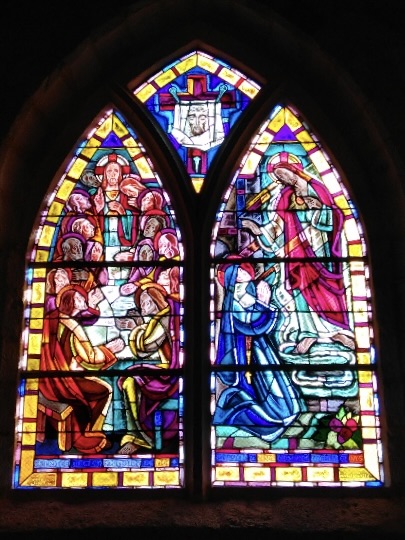 Simboli della Passione, vetrata, 1900-1999, église Saint-Martin, Drosay, Seine-Maritime, Francia.