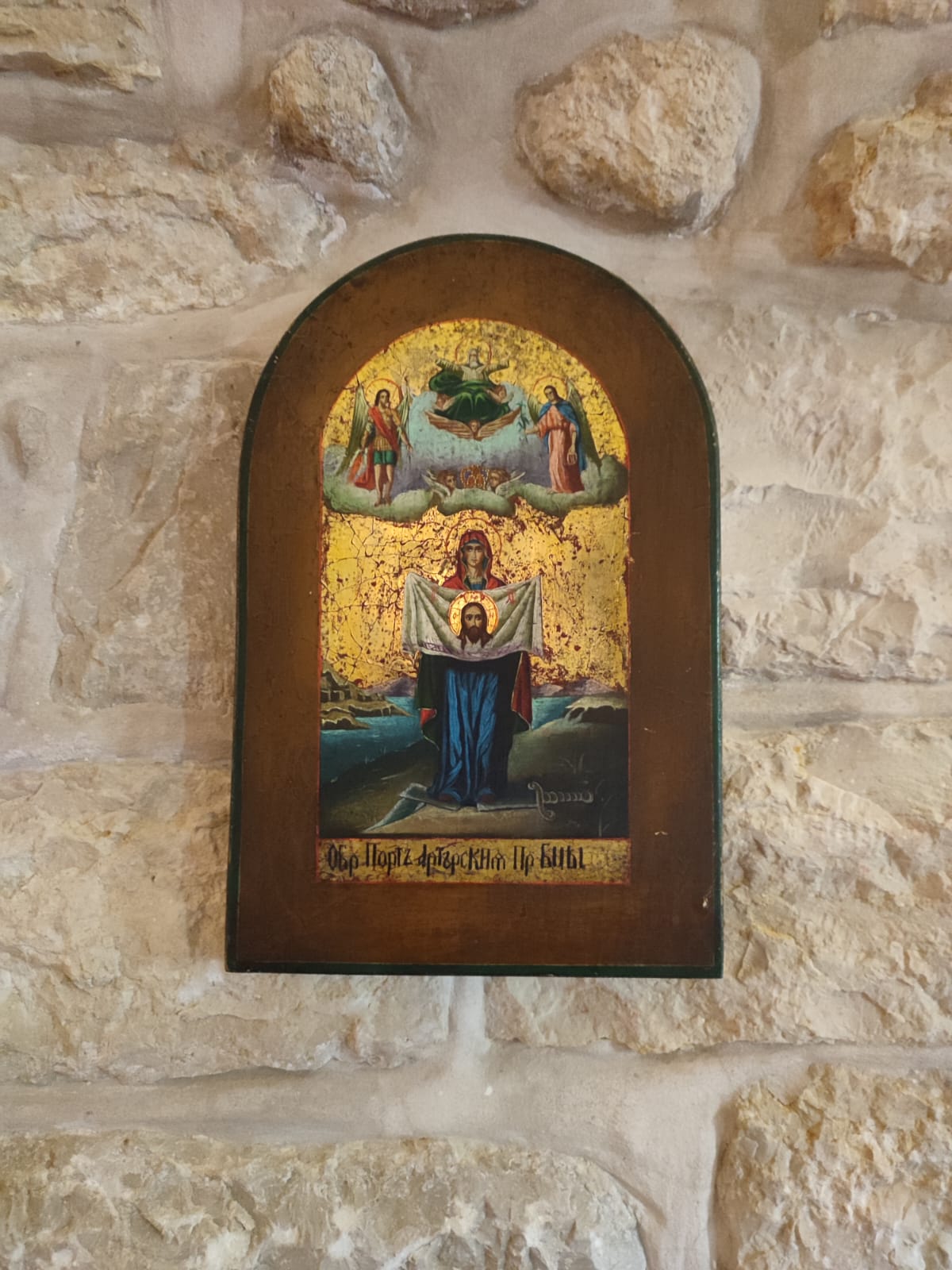 Sotto l’immagine la scritta “Madonna di Arthur”. Il riferimento è all’icona della Madonna di Port Arthur, dipinta nel 1904 su indicazione del marinaio Theodore Katansky. L’icona di Betlemme, dono di un pellegrino alle Suore Brigidine, è una delle rare copie dell’icona.