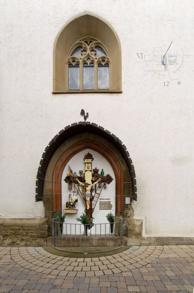 Friedbert Andernach, Croce di Longino, rilievo, 1992, muro esterno lato sud, kath. Stadtkirche Unsere Liebe Frau, Eppingen, Germania.