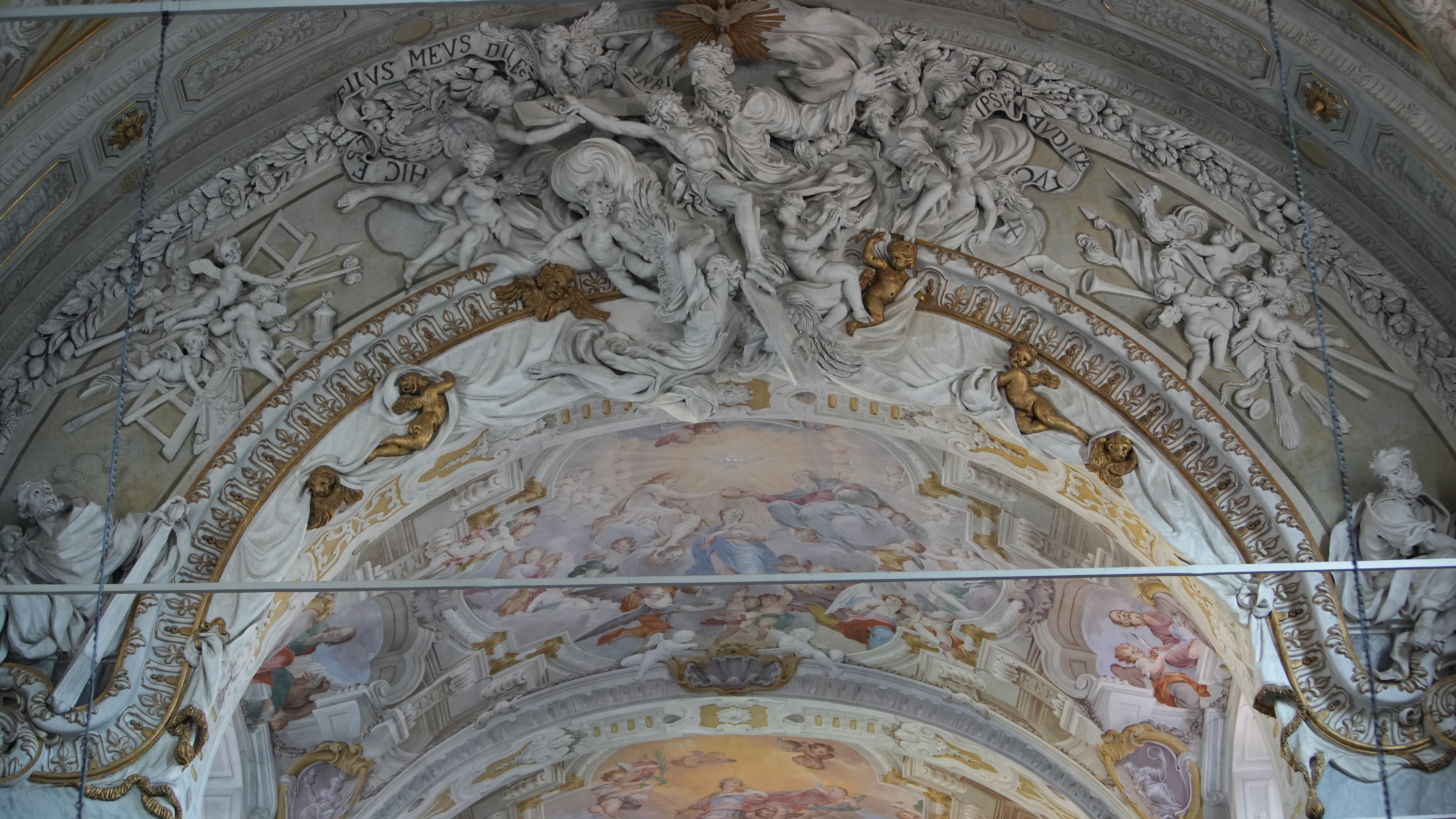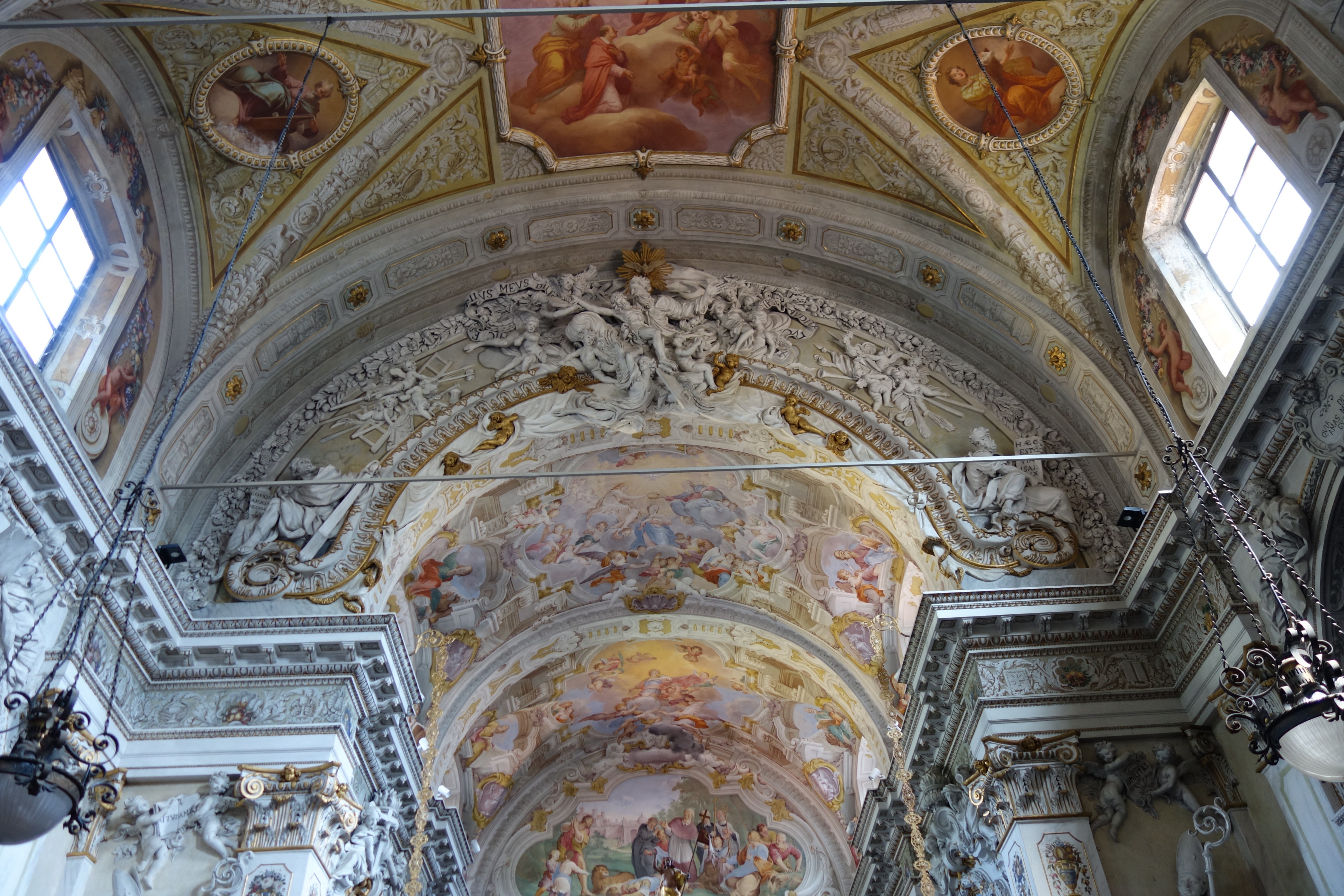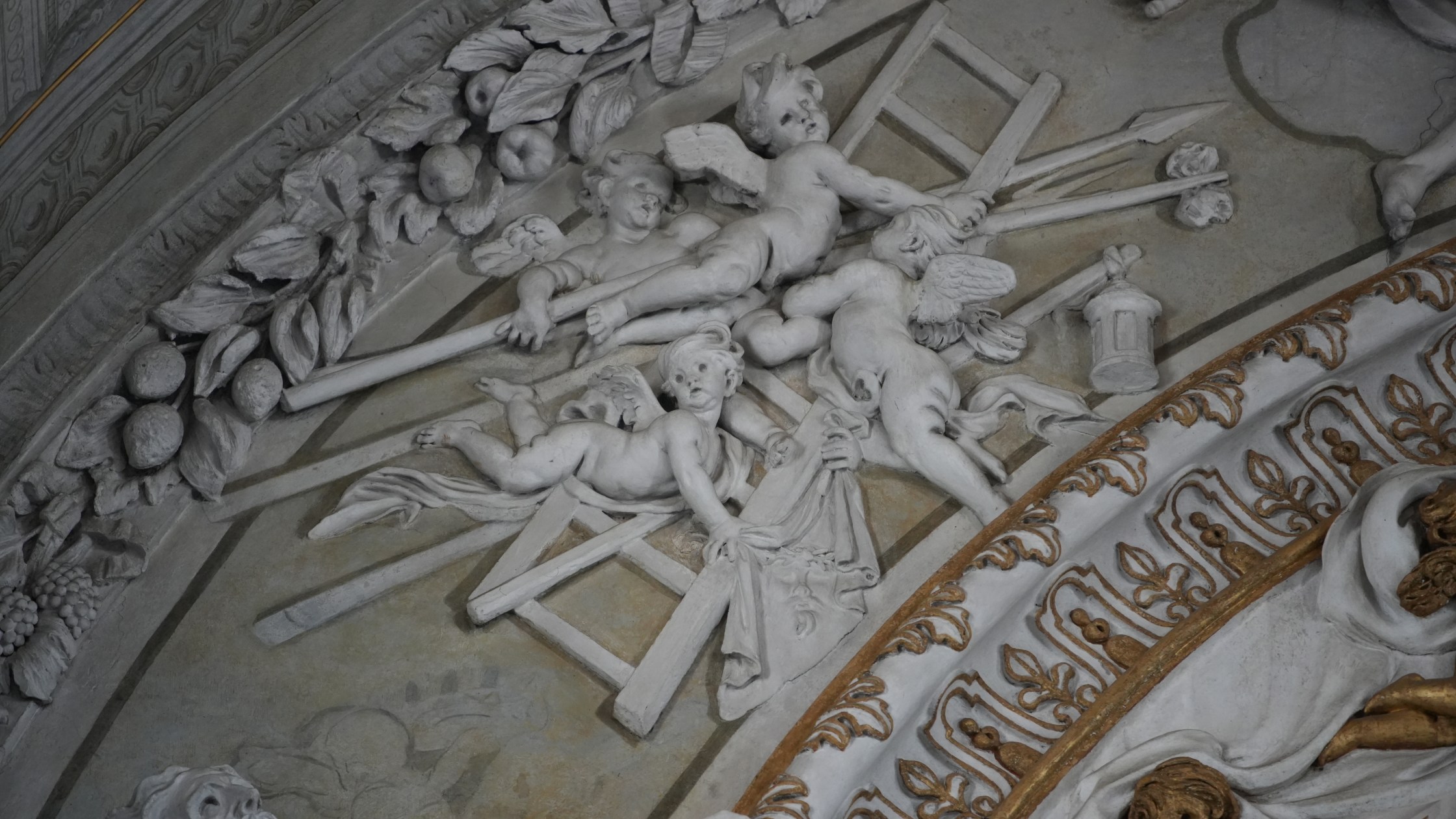 Giovanni Maria Muttoni, Angeli con i simboli della Passione, arco trionfale, stucco, 1736, chiesa di San Vittore, Porlezza (Co), Italia.